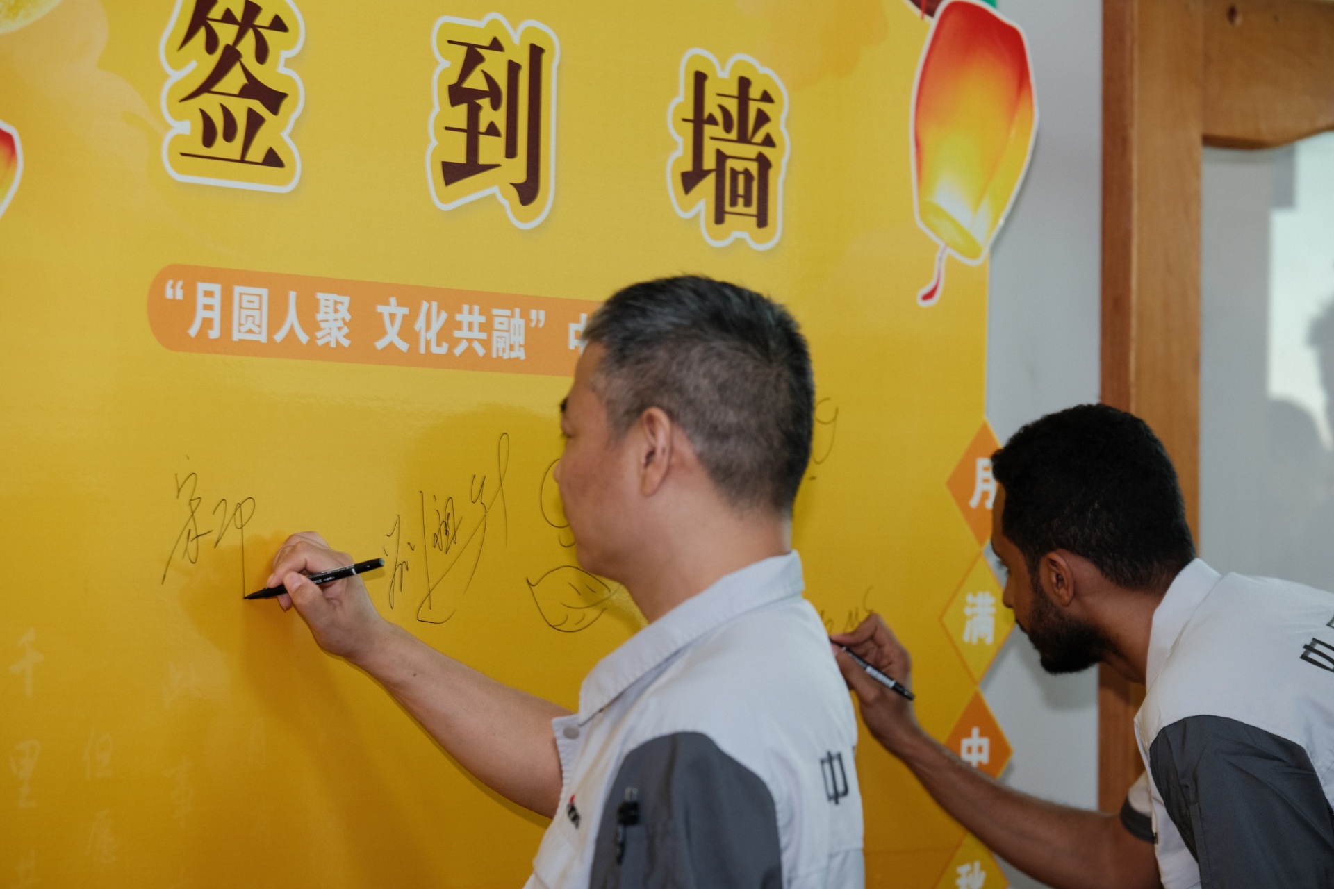 “عيد مهرجان منتصف الخريف سعيد”“月满中秋,福满人间”“Happy Mid-Autumn Festival”中英阿三国的祝福语言交织在活动签到墙上,形成了一幅色彩斑斓的语言画卷,增添了节日的喜庆氛围,展现文化交融的和谐之美。